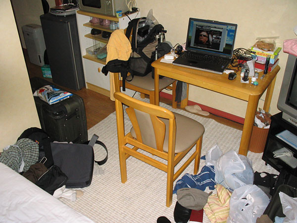 I have a couple days off, which is good, since I need to clean up my apartment. I haven't put anything away, and I need to buy a few things to organize this place. Plus Ben is coming here on Wednesday, so I need to make room. Here is a wonderful shot of my tiny apartment, and a great example of how cluttered it is.