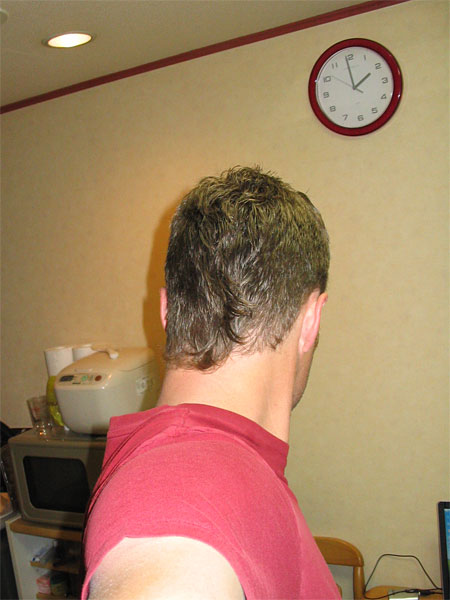 I cut my hair off today. I was the barber. (My hair)+(Japan's humidity)>(free space in Japan) It is just a fact, so the hair had to go. Luckily, the very back of my hair that I didn't want to cut was also the most difficult to reach, so I just left it alone. As you can see, it was just about 2 p.m. when I finished up. I started hours earlier and did a little at a time, since Nicole had set up a web-cam at home so I could watch the Jazz game.