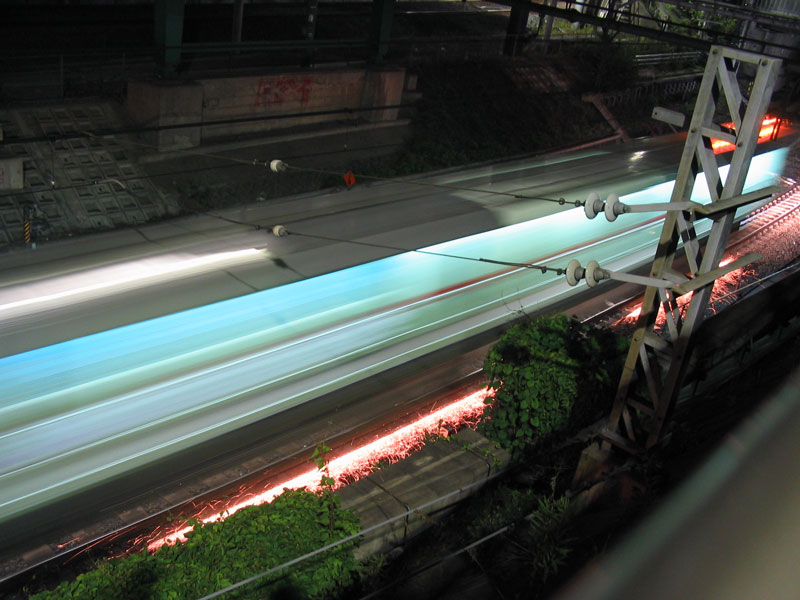 I figured it was grinding on the tracks for some reason. And as it past, you could see the tracks not only were really shiny, but also had a rotation pattern in it. The machine was just doing a couple-hundred yard section, over and over. As it passed you could smell burning metal, like someone was welding. And glowing red pieces of steel laid to the sides of the tracks. I got a long-exposure shot of one pass of the train. Then my batteries died.