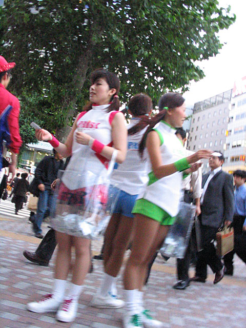 The picture today was taken outside of the Ebisu train station, from the hip. These three girls were handing out sample packets of "Frisk" mints. Whenever they do anything like that, they always have cute little outfits to match. This was the first time I have seen the power-triangle used though. I think it helps them maintain position during the stampedes of people. "Kids! There is an earthquake! Get under your desks!" "Kids! There is a fire! Get in a single-file line and walk outside!" "Kids! Here comes a huge crowd of people! Form a power-triangle and maintain position!"