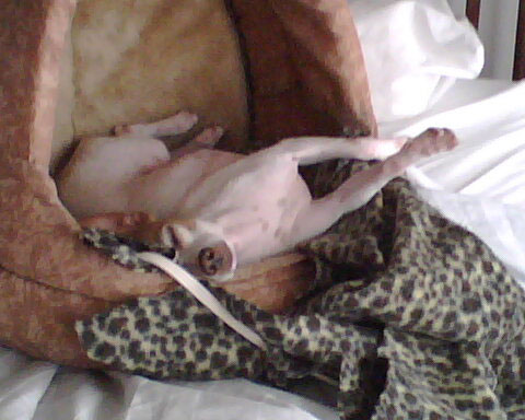 Today is my dog KC's birthday. He is a stinker. He is four today. That picture was of him this morning, sleeping in his bed. Sometimes he lies in the strangest positions to sleep. This is how he chose to sleep on his birthday morning. If you haven't seen his fantastic video of him walking on his hands because the ground is cold, click this.