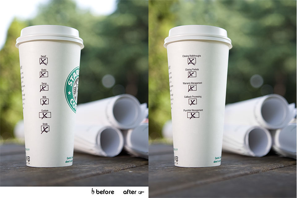 All last minute stuff like all design work is. The picture is a before and after of the photograph. They needed the logo from the cup gone, and new check-box titles placed on that are relevant to the company. They needed more table at the bottom for spacing issues. And the background needed some touching up. I hope you like the final results, even though they mean nothing to you unless you see how it goes with the ad in its entirety.