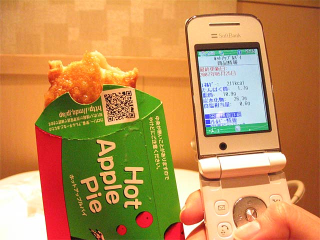The picture of the day is something I took there. Products and posters and all sorts of different things all over Japan have these little barcode-looking things, as you can see on top of the apple pie package. They contain all sorts of information. In this case, it is all the nutritional value of the apple pie. Most cell phone have the technology to read them. You use the camera on your phone, point it at the barcode, and move it around until the camera makes a correct scan of it. Then all the appropriate info comes up on your screen.